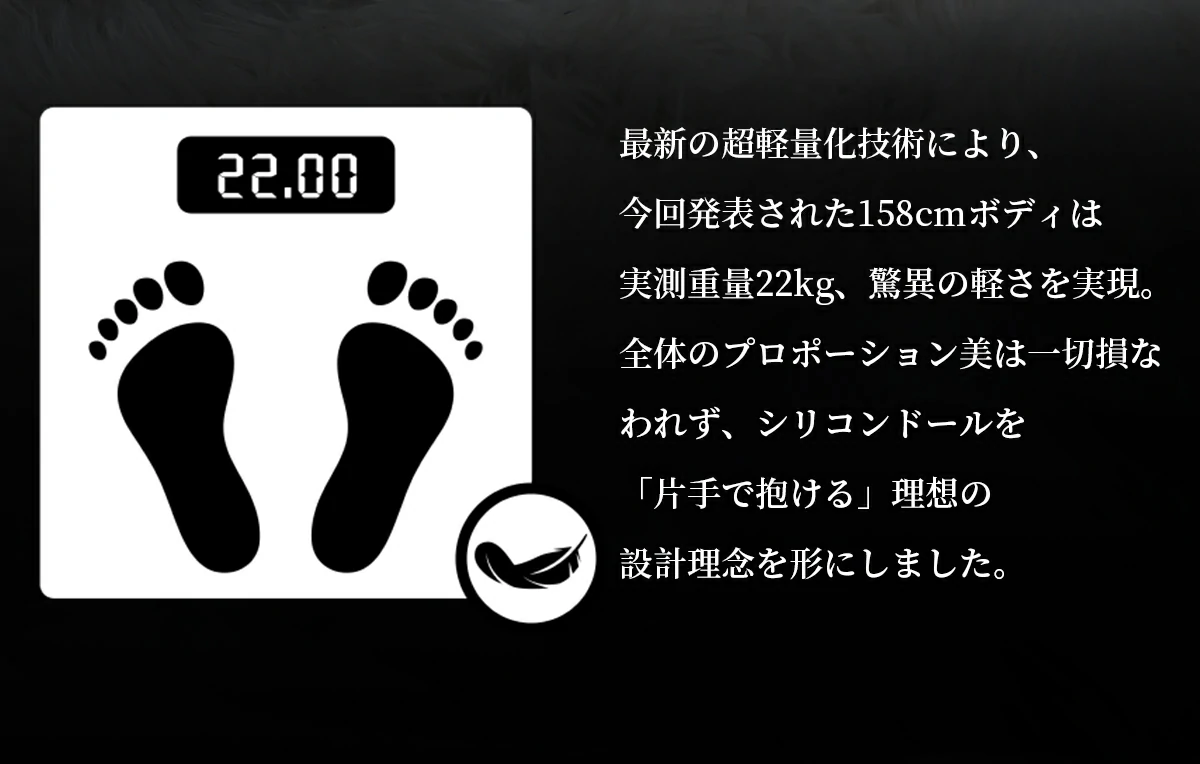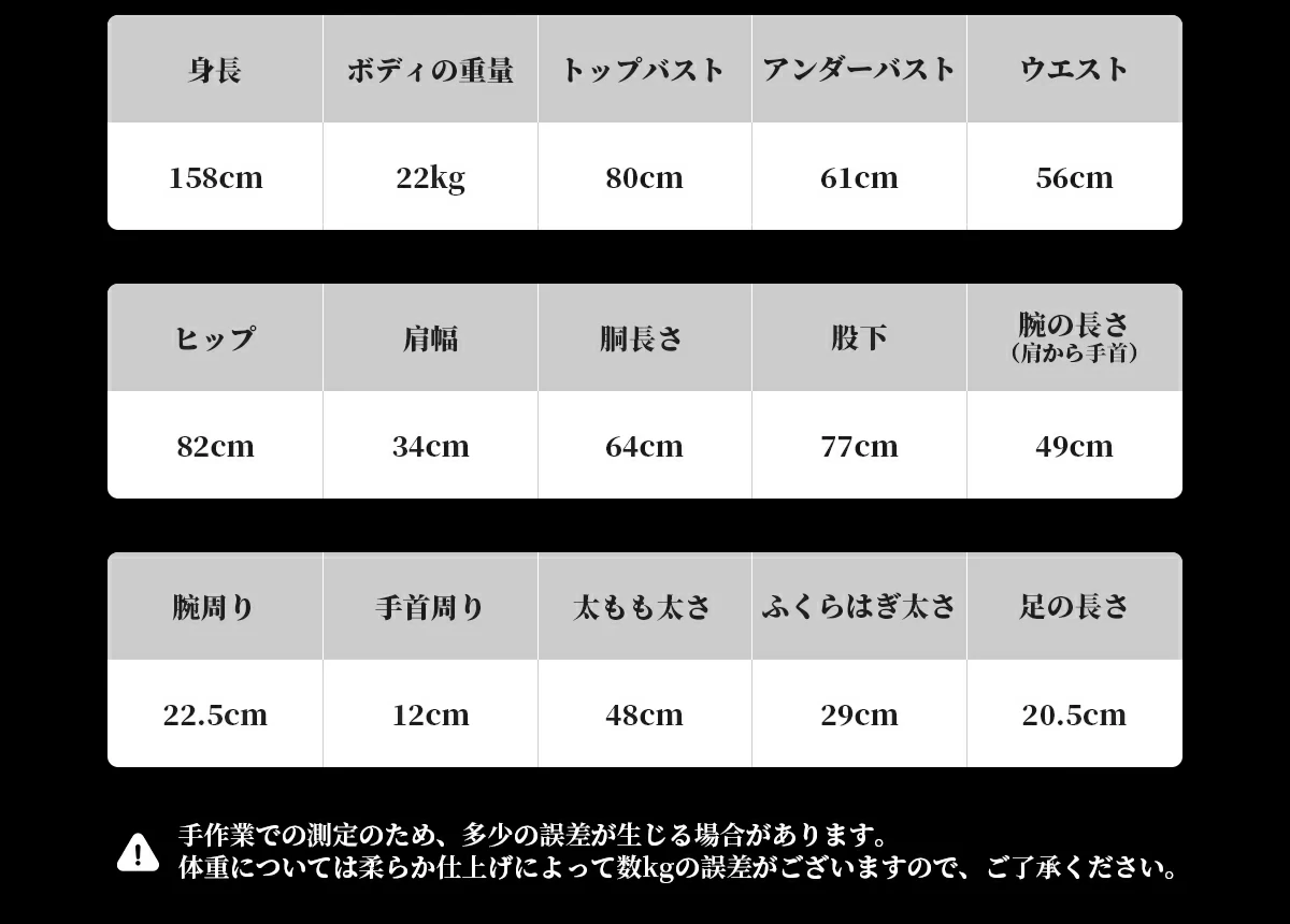 身長:158cm-Eカップ、重量22kg、トップバスト:80cm、アンダーバスト:61cm、ウエスト:56cm、ヒップ:82cm。肩幅:34cm、腕の長さ:49cm、足サイズ:20.5cm、ヴァギナの深さ:10cm/13cm/15cm、アナルの深さ:8cm位、口の深さ:無し、梱包サイズ:147x45x35 cm.